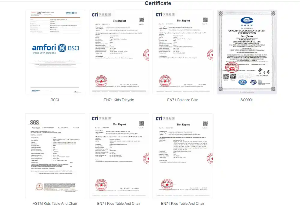 다음과 같은 인증EN71그리고ASTM우리의 것을 나타냅니다어린이와 유아 세발 자전거 for는 재질이 무독성인지, 모서리에 손이 잘리는지, 부품이 견고한지, 안전 기준을 충족하는지 등의 전문적인 테스트를 거쳤습니다.